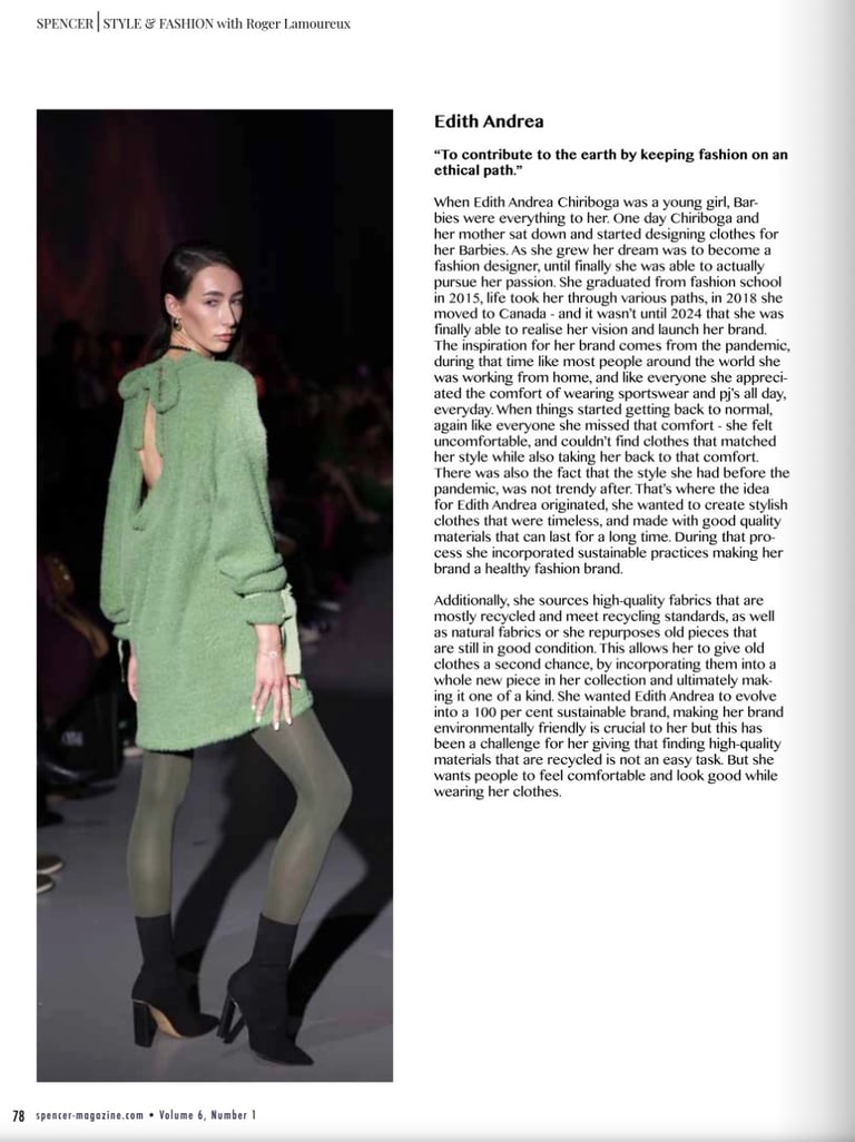 Edith Andrea Chiriboga, a fashion designer who graduated in 2015 and later moved to Canada, established her brand with this guiding vision. Inspired by the pandemic and the desire for comfortable yet stylish clothing, her label focuses on creating timeless, high-quality garments that last, utilizing sustainable practices, natural fabrics, and repurposed materials. Ultimately, Edith Andrea aims for a fully sustainable brand that empowers wearers to feel both comfortable and elegant.